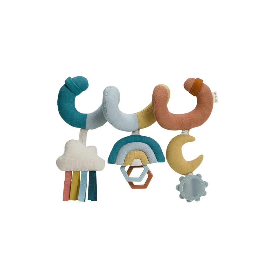 Keep baby busy on long car rides or walks in the stroller for fun on the go. Watch baby smile in the hanging mirror, keep their hands busy with the grasping ribbons and clinking sounds from the rainbows, we love this as a gift because it is both beautiful and useful.